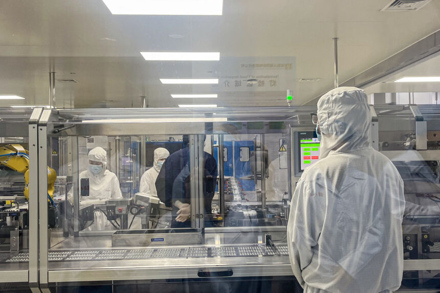 YICHANG, China — Behind a large glass wall, a worker in full protective gear watches as hundreds of tiny glass bottles whizz by every minute, sterilized, filled and packaged by a ballet of robotic arms
